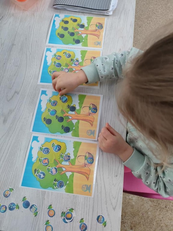 10.10 Światowy Dzień Drzewa – rozwijanie poprawnego toru oddechowego, wzmacnianie mięśnia okrężnego ust. Wzbogacanie mowy biernej i czynnej. Kształtowanie i rozwijanie rozumienia mowy. Powiększanie zasobu słownictwa czynnego w obrębie wszystkich części mowy. Rozumienie i używanie przymiotników, liczebników, przysłówków. Rozumienie relacji przestrzennych. Podczas zajęć dzieci zdobywały wiedzę na temat drzew. Określały kolory ich liczebność przenosiły za pomocą słomki liście drzew na kartkę.
