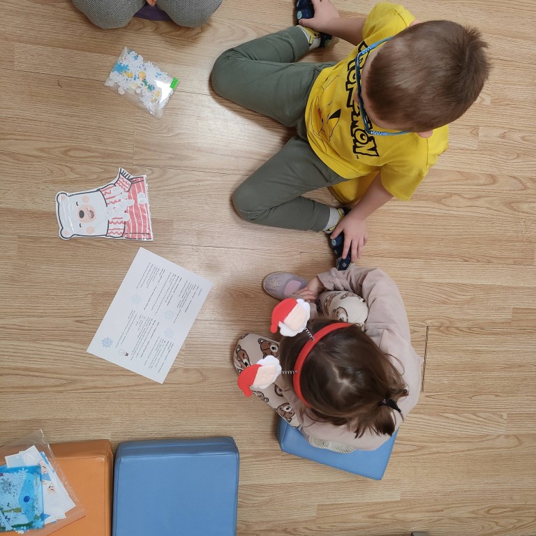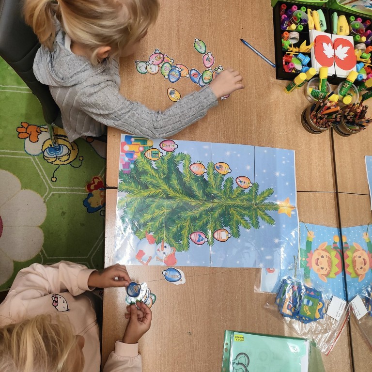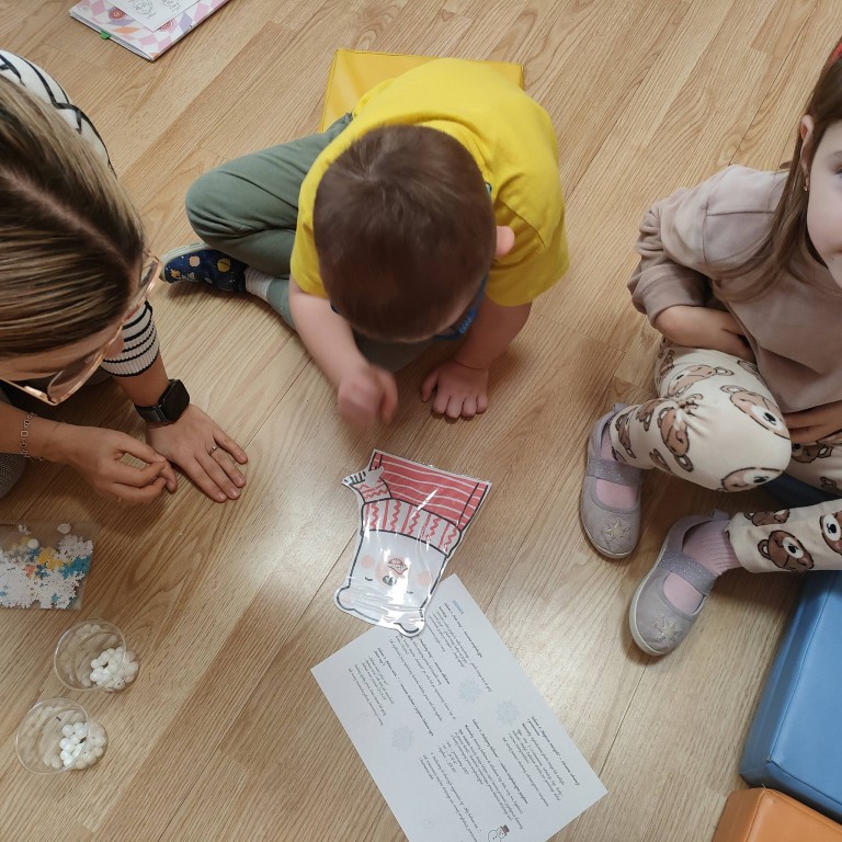 Podczas zajęć dzieci dobierały cienie w pary, budowały bałwanka z części, słuchały opowiadania, układały historyjkę obrazkową oraz śpiewały piosenkę I'm a little snowman. W salach natomiast dzieci tworzyły prace plastyczne.