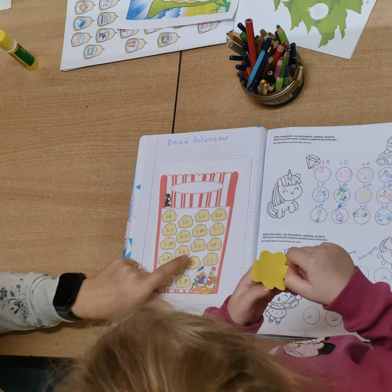 19.01.2026 Dzień popcornu – podczas realizacji tego dnia, dzieci ćwiczyły motorykę narządów mowy, realizowały ćwiczenia oddechowe z słomką, a także prawidłową pozycję spoczynkową języka.